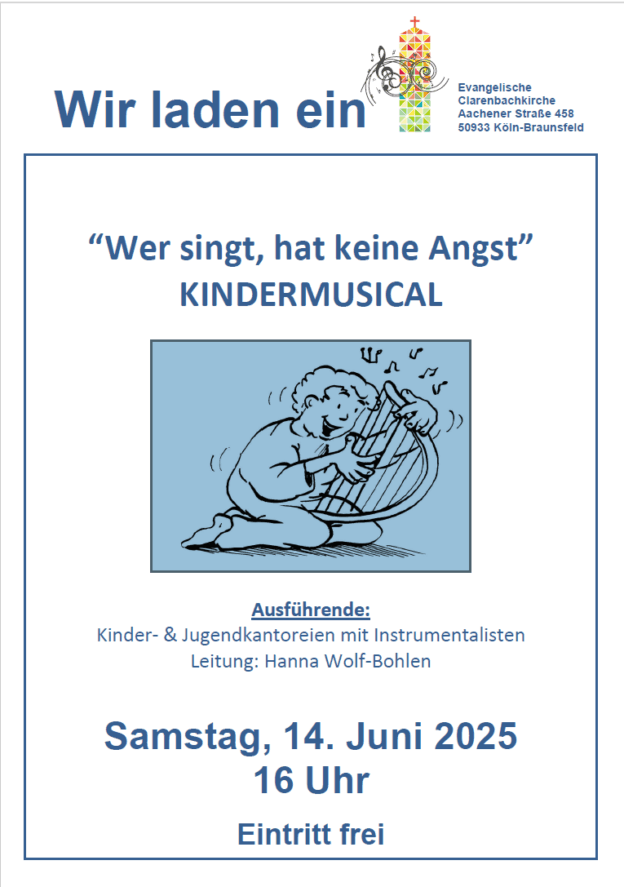 KS Kindermusical „Wer singt hat keine Angst“ am Samstag, 14. Juni 2025, um 16.00 Uhr in der Clarenbachkirche Ausführende: Kinder- und Jugendkantoreien mit Solisten